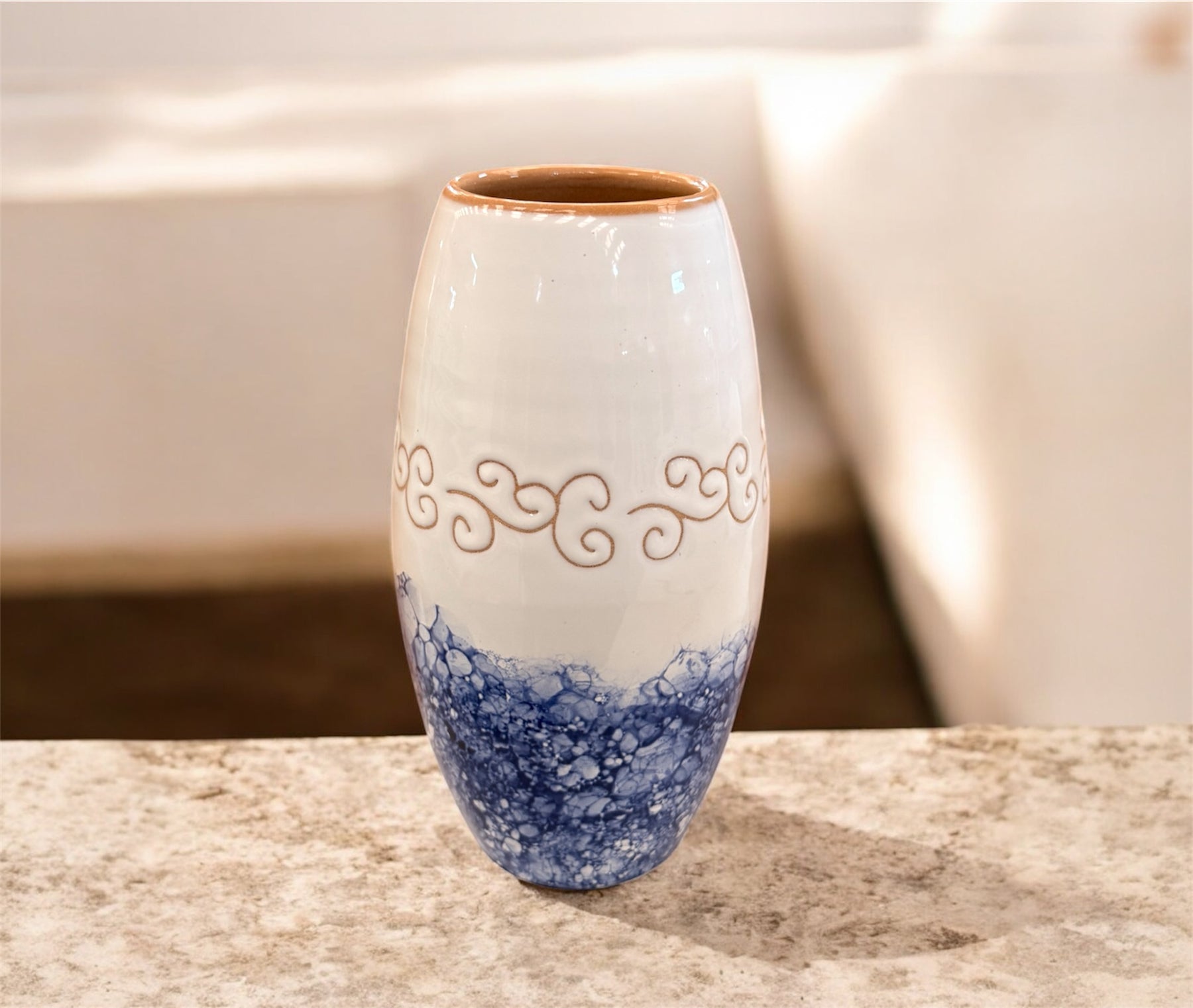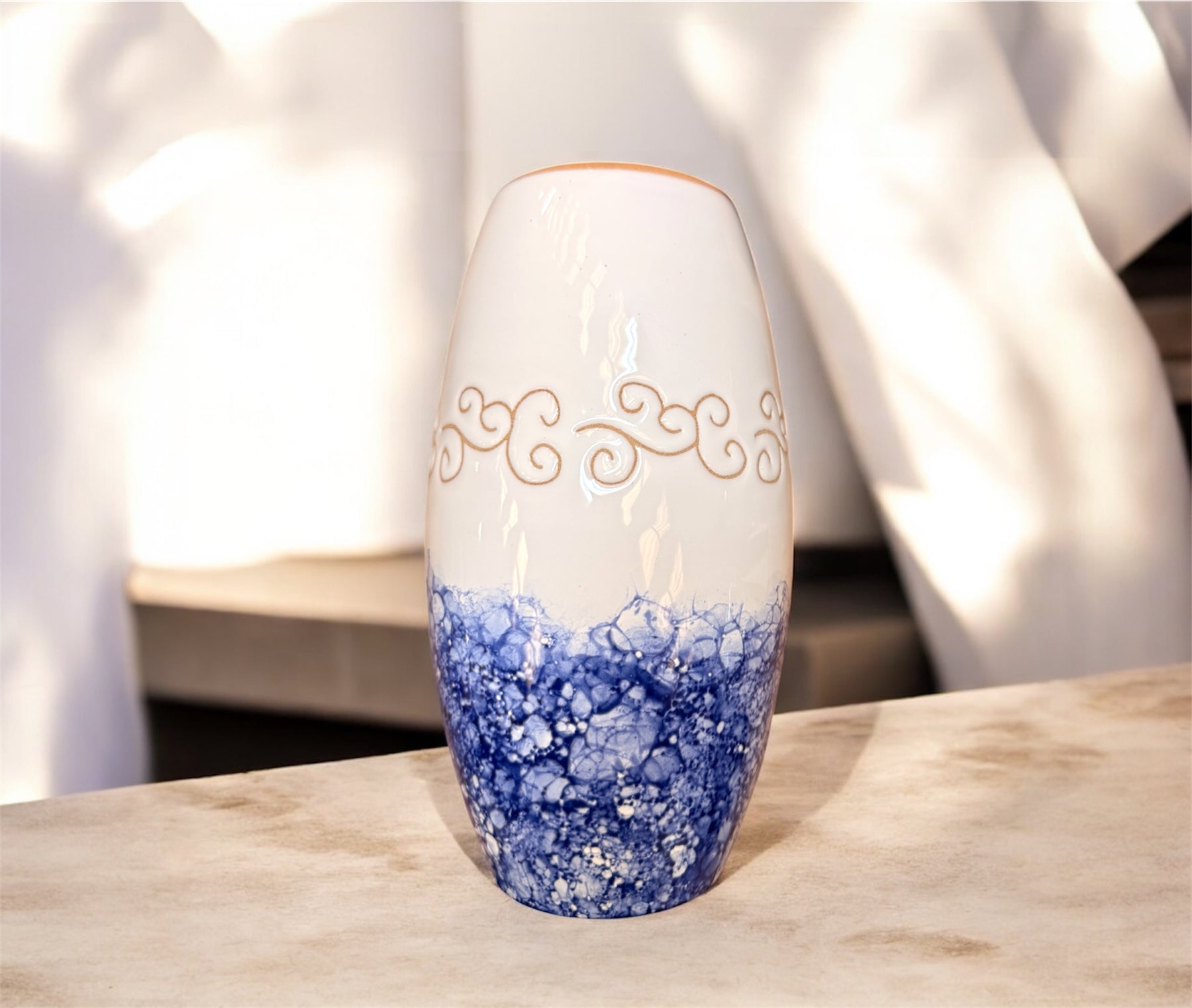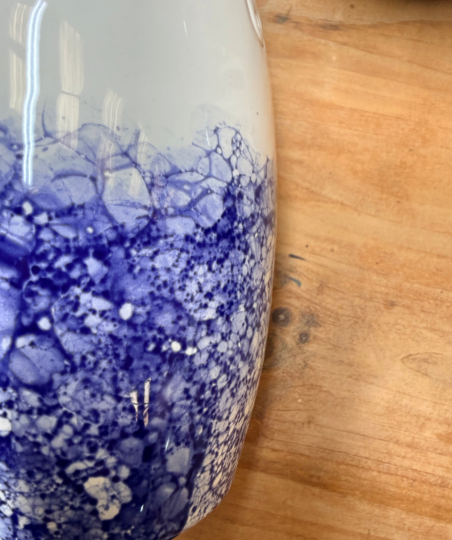 Decorato con "bolle" blu e riccioli su sfondo smaltato bianco